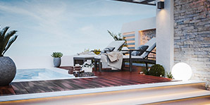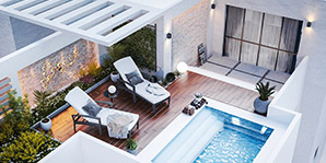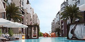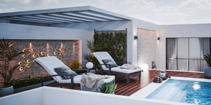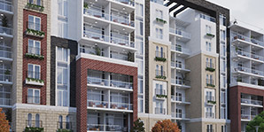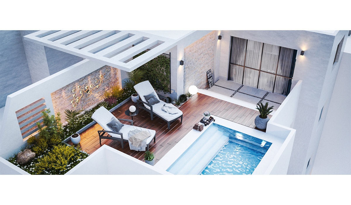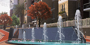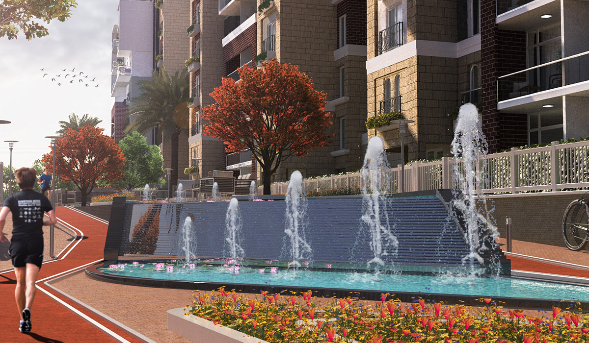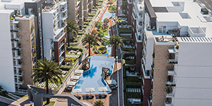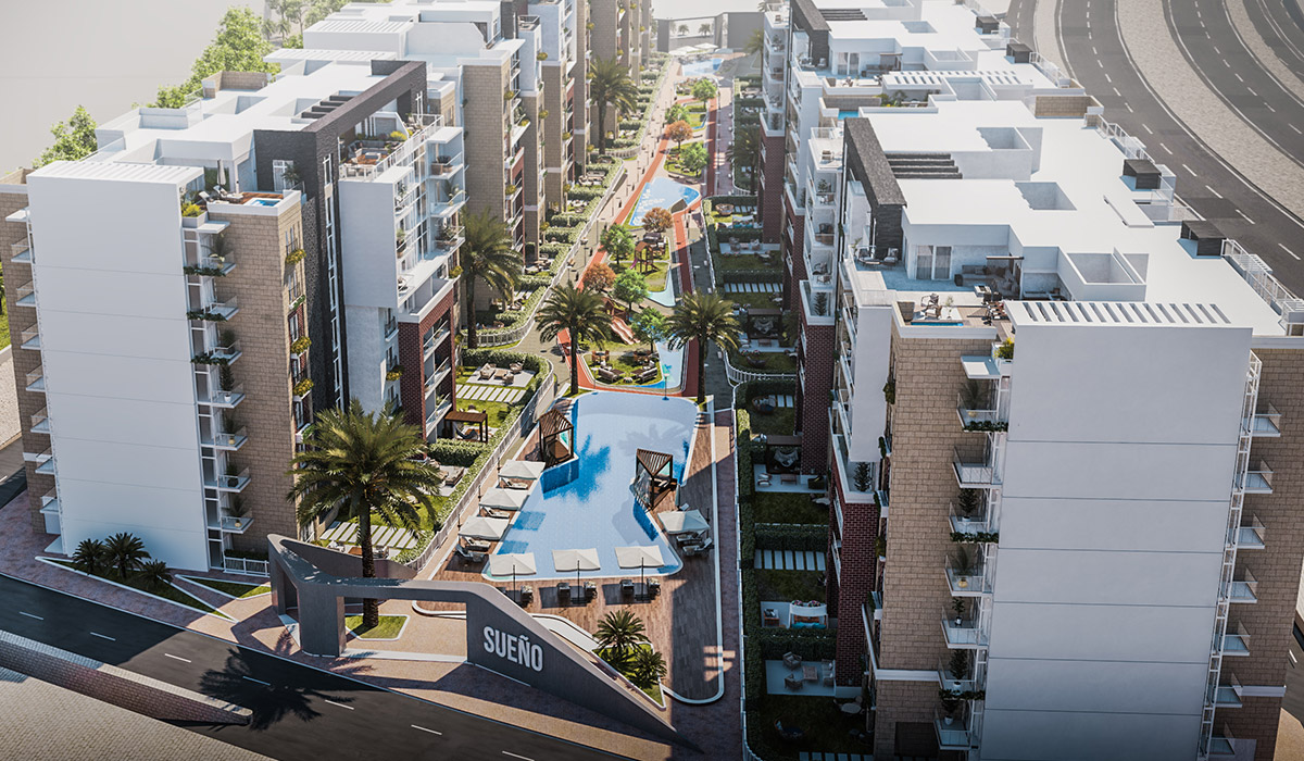 The residential community is located in the New Capital, Cairo on a total land plot of about 46,377m² with a total built-up area of 69,437m². The compound is divided into 4 types of post-modern designed buildings with a Spanish architectural twist cascading across a three (3) level masterplan. The residential units consist of 2-bedroom apartments, 3-Bedroom apartments, duplexes, penthouses, a gym and commercial spaces, encompassed within a lavish landscape that includes an infinity pool, swimming pool, and other water features such as fountains and a waterfall, as well as a kids play area, pathways and outdoor seating areas. The roof top is designed for solar water heater system installation along with a one level basement for car parking.